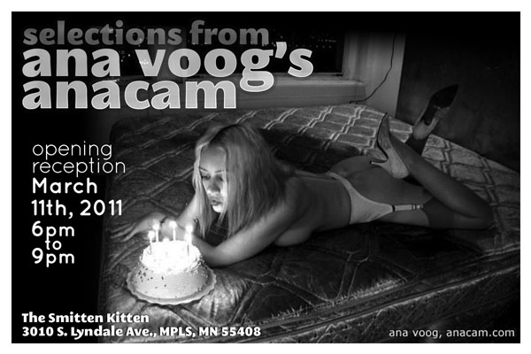 Since August 22, 1997, the world has seen a lot of Ana Voog. From daily activities like vacuuming and hosting guests to building a free-form crochet hat empire (you can buy one of your own on her website) to the conception and birthing of her first child, the 24/7 of Voog’s life has been on display via anacam, the longest running webcam slash conceptual art experiment to date. Friday at Smitten Kitten, both fans and those unlucky ones who’ve been out of the loop the past fifteen years can enjoy a sampling from the anacham archives and even take a favorite or two home. Be prepared for anything and everything – in Ana’s world, extreme (and extremely sexual) is norm. Not that we’d have it any other way.